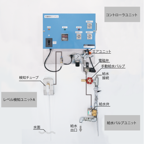 this pressure (back pressure) is measured using a high-sensitivity sensor. This system maintains the water level in the painting booth within a certain range by detecting the water level and operating the water supply pneumatic valve to supply water according to the water level.