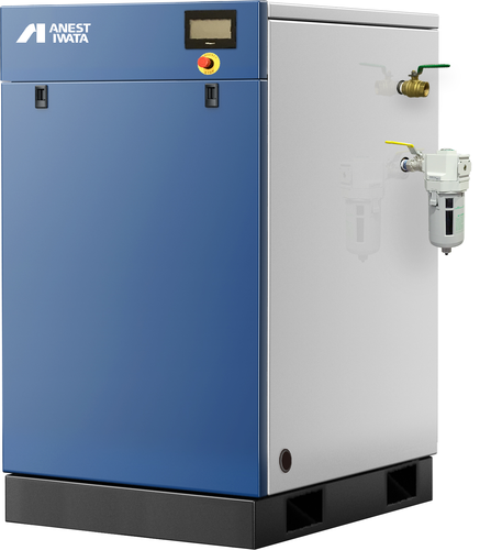 A 0.75-30kW oil-free compressor with a low-noise, low-vibration compressor body housed in a soundproof package for improved quietness .